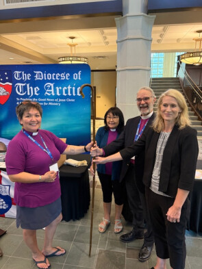 The picture accompanying this blog is a complex one, and I want to note its various strands.. It was taken at RADVO, the discernment conference held once more at Incarnation, Dallas. I have used a crozier on loan to me from Wycliffe College, where I was for many years the principal. It did not belong to me, but needed, when the time for retirement had come, to be handed on to the newest Wycliffe-related bishop. And so I am handing it to Ann Martha, an Inuk suffragan in the Arctic. Taking part is the new principal of the College, Kristen Johnson, whose installation I took part in just after the conclusion of the conference. But there was a particular appropriateness to giving the staff to Ann Martha, since the first bishop of the Arctic was a Wycliffe graduate, Archibald Fleming, who as a missionary envisioned just such a moment (the other woman in the picture is Annie Nepartuk, a student in my time and the first woman Inuk bishop)