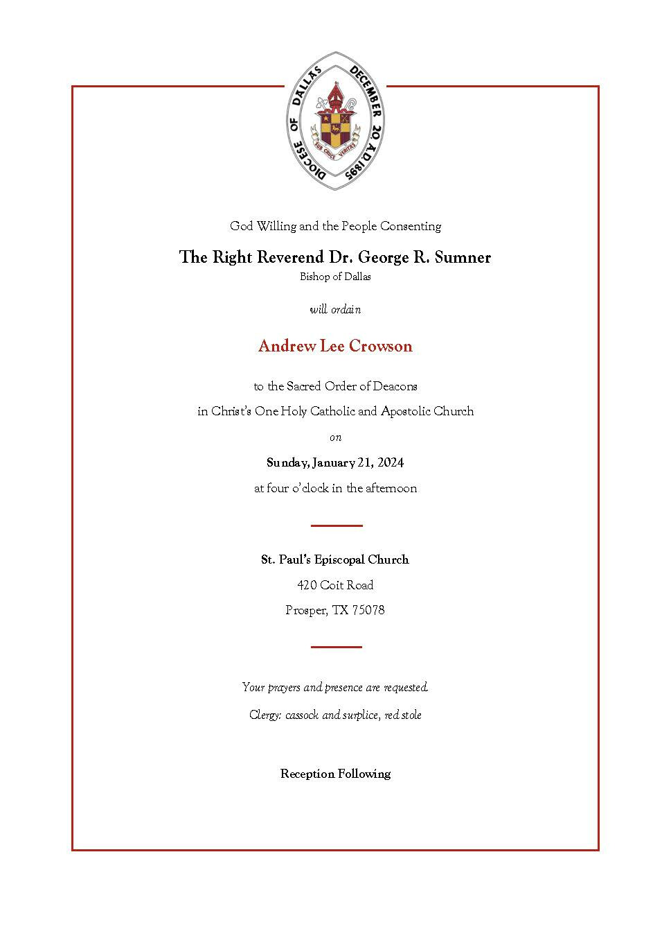 The Ordination of Andrew Lee Crowson to the Sacred Order of DeaconsSunday, January 21, 2024, 4:00 PM - 7:00 PM Location: St. Paul's, Prosper , 420 S. Coit Road , Prosper, TX US 75078Download: Download Event