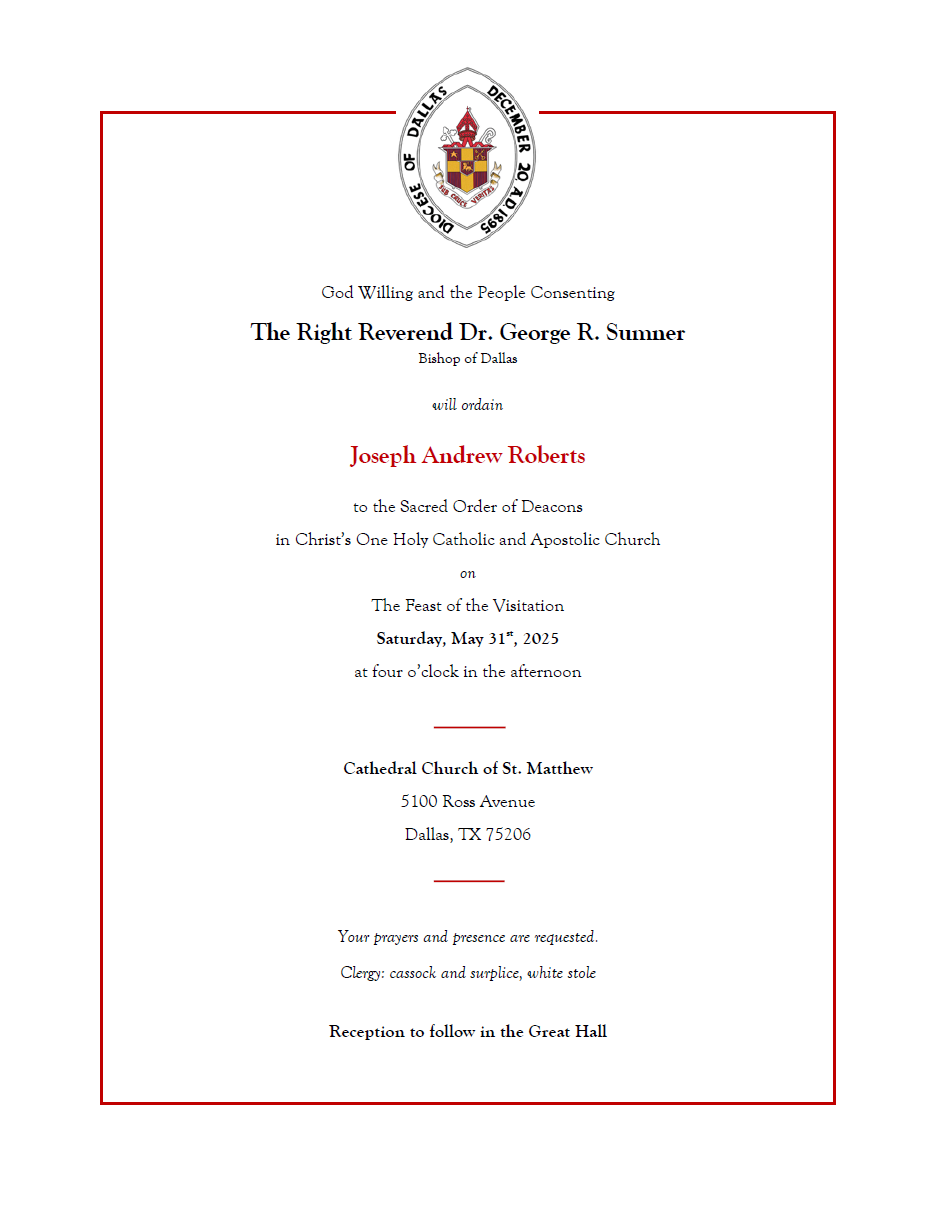 Diaconal Ordination of Joe RobertsSaturday, May 31, 2025, 4:00 PM - 6:00 PM Location: St. Matthew's Cathedral, 5100 Ross Ave., Dallas, TX US 75206Download: Download Event