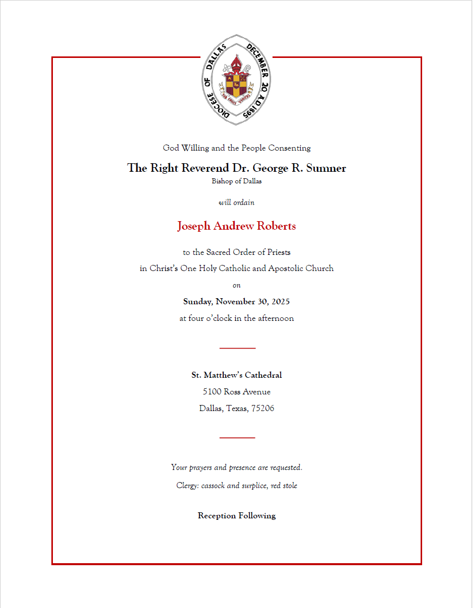 Priestly Ordination of Joe RobertsSunday, November 30, 2025, 4:00 PM - 6:30 PM Location: St. Matthew's Cathedral, 5100 Ross Ave., Dallas, TX US 75206Download: Download Event